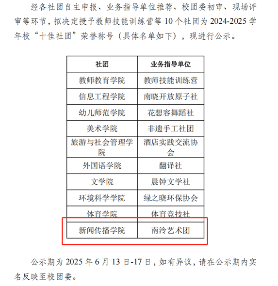 2025年6月12日,新葡的京集团3512vip2024-2025学年“十佳社团”评议会在方山校区行政楼二楼报告厅圆满落幕,新葡的京集团3512vip南泠艺术团凭借卓越表现,成功入选“十佳社团”,为学院社团发展续写辉煌篇章!